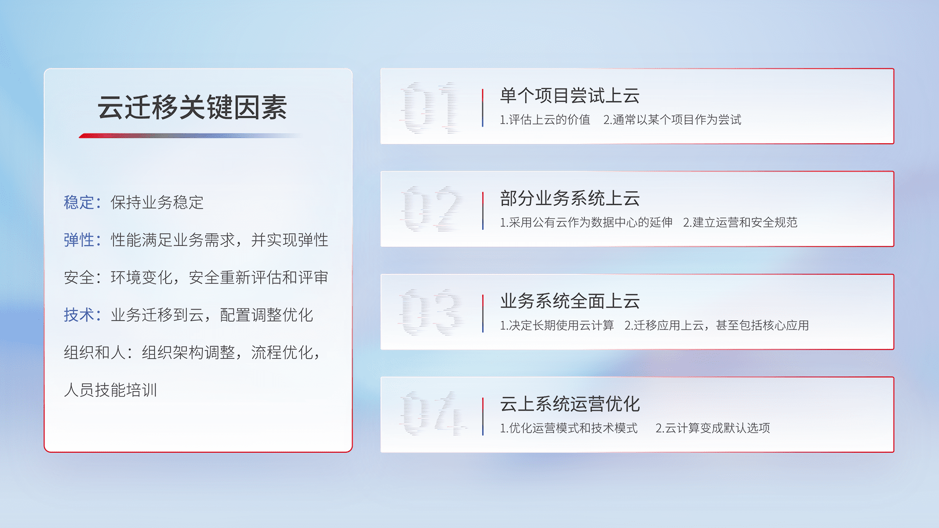 结合实际业务,,,从规划设计、、云平台选型、、、云原生改造、、、数据迁移、、、集成交付,,迁移全过程为客户识别最佳上云路径,,做好风险识别管理,,,,设计网络架构、、、身份权限、、安全审计合规、、、操作审计、、、、日志审计、、、、监控告警策略、、多站点容灾设计等,,,,对云上基础设施进行整体规划,,提升IT治理水平,,以满足弹性、、高可用、、、高性能的需求。。。。